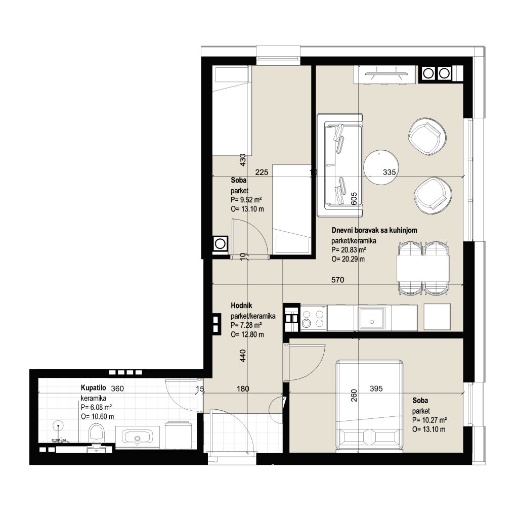 Vanjska stolarija je PVC VEKAsot line 82 vanjska boja antracit unutra bijela, sedmokomorni profil, troslojno staklo. Unutrašnja stolarija drvena bijela, vrata visine 220 cm. Vanjska izolacija 20 cm. Pod parket hrast.
