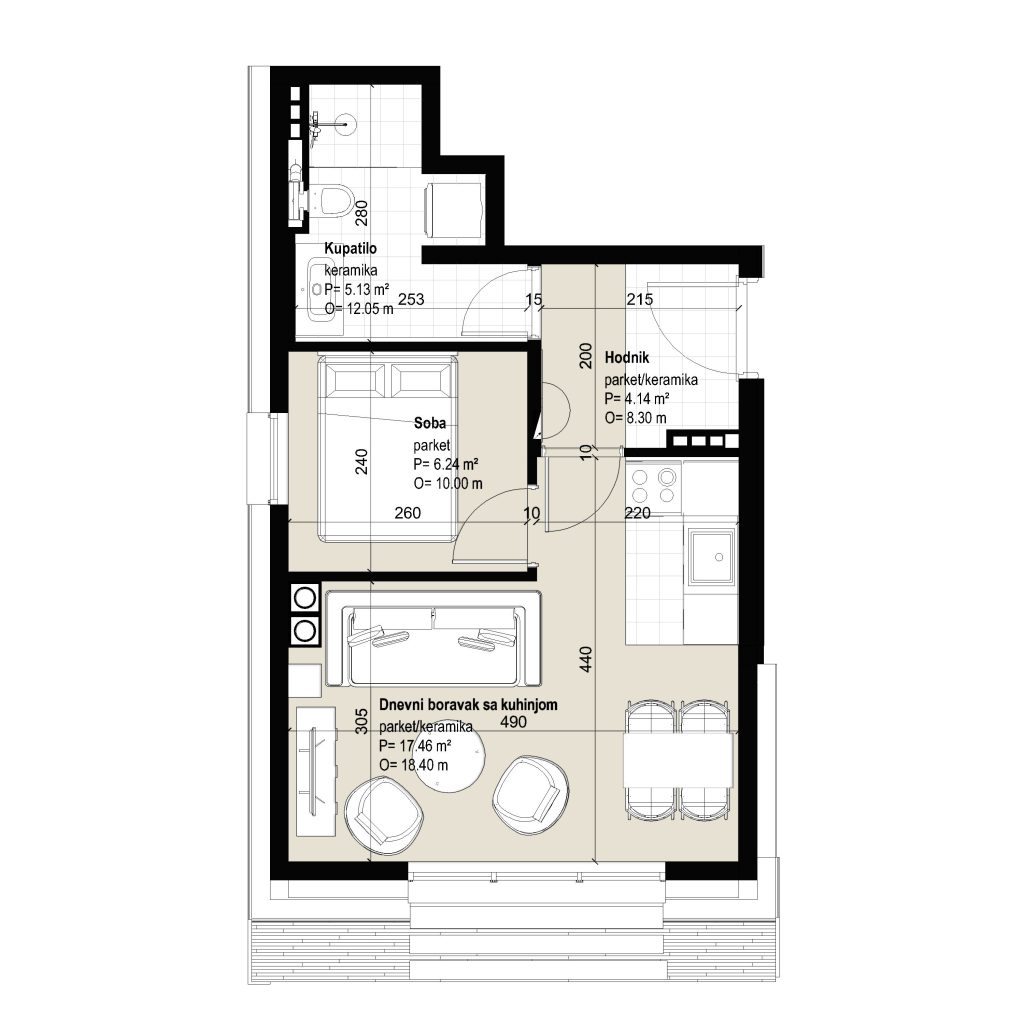 Vanjska stolarija je PVC VEKAsot line 82 vanjska boja antracit unutra bijela, sedmokomorni profil, troslojno staklo. Unutrašnja stolarija drvena bijela, vrata visine 220 cm. Vanjska izolacija 20 cm. Pod parket hrast.